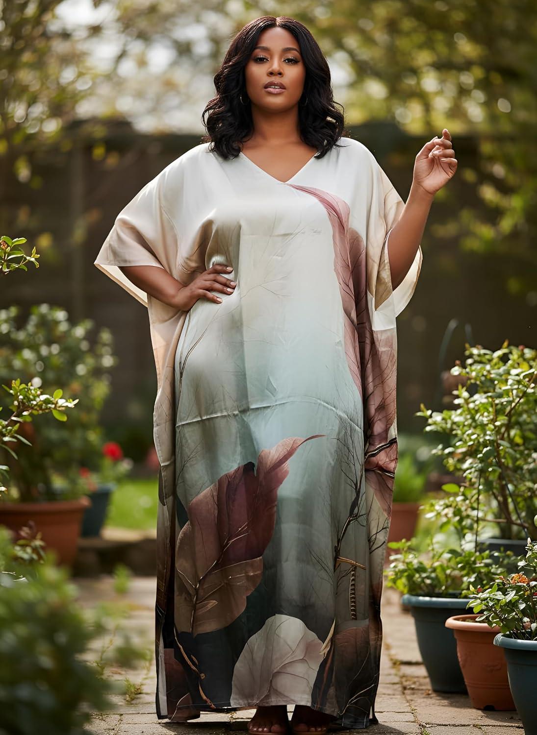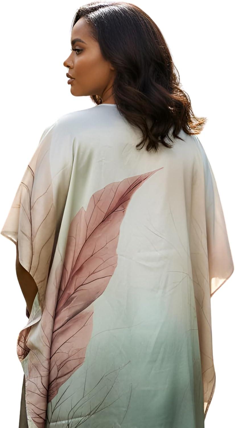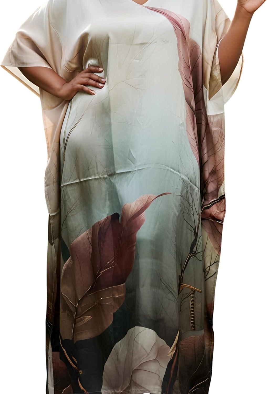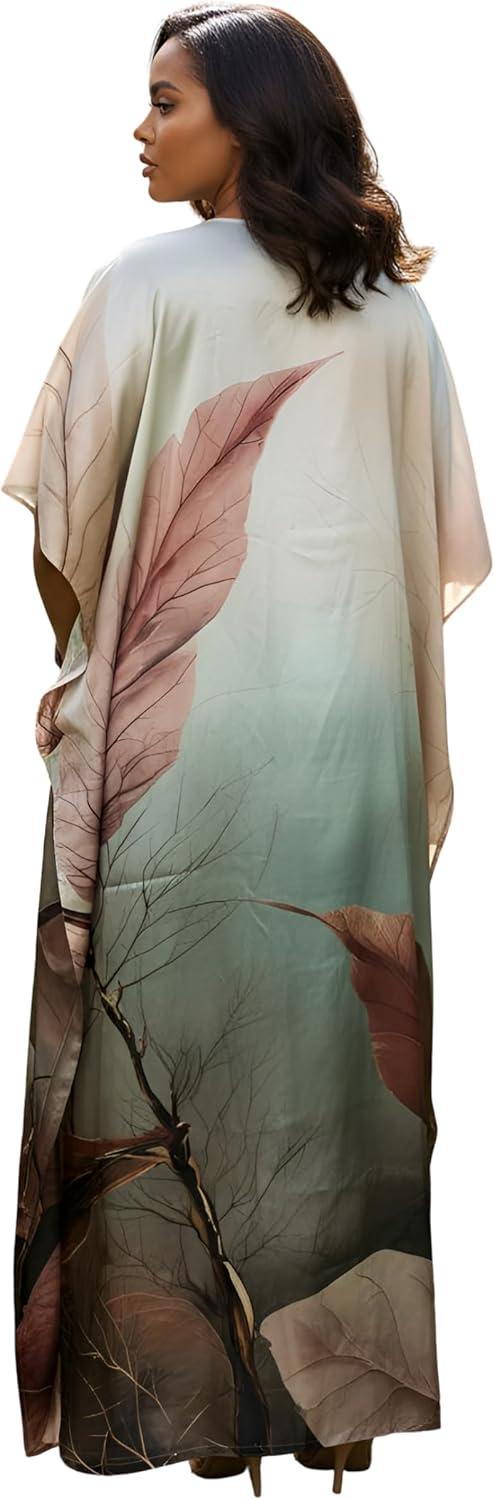 Gypsie Blu Women Caftan Dress Plus Size Satin Silk Printed Beach Cover Up Maxi Dresses Kimono Sleeve for Holidays Lounge Wear(Cream Leaf)