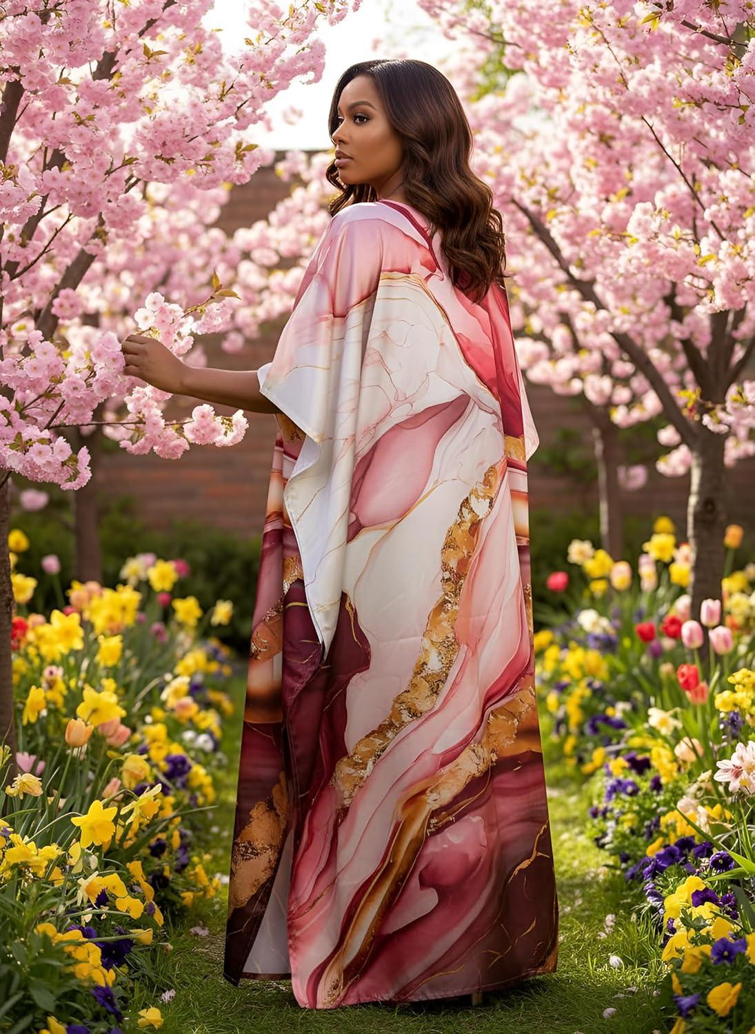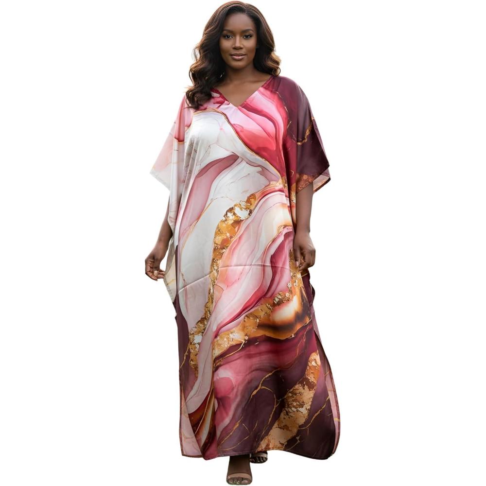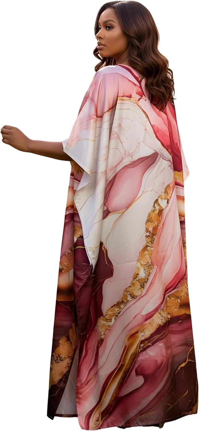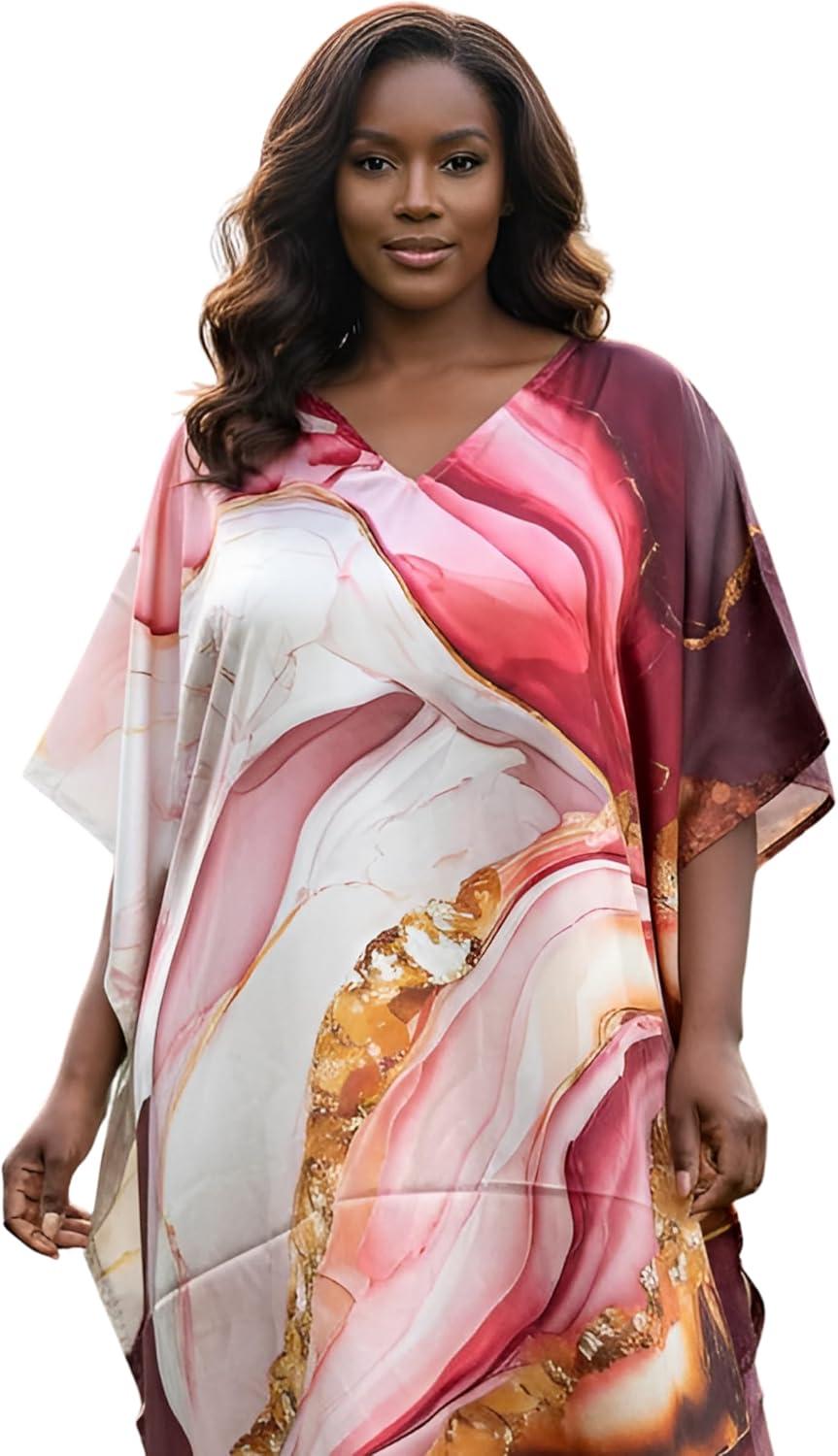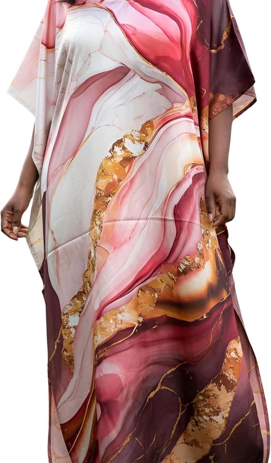 Gypsie Blu Women Caftan Dress Plus Size Satin Silk Printed Beach Cover Up Maxi Dresses Kimono Sleeve for Holidays Lounge Wear(Deep Rose)