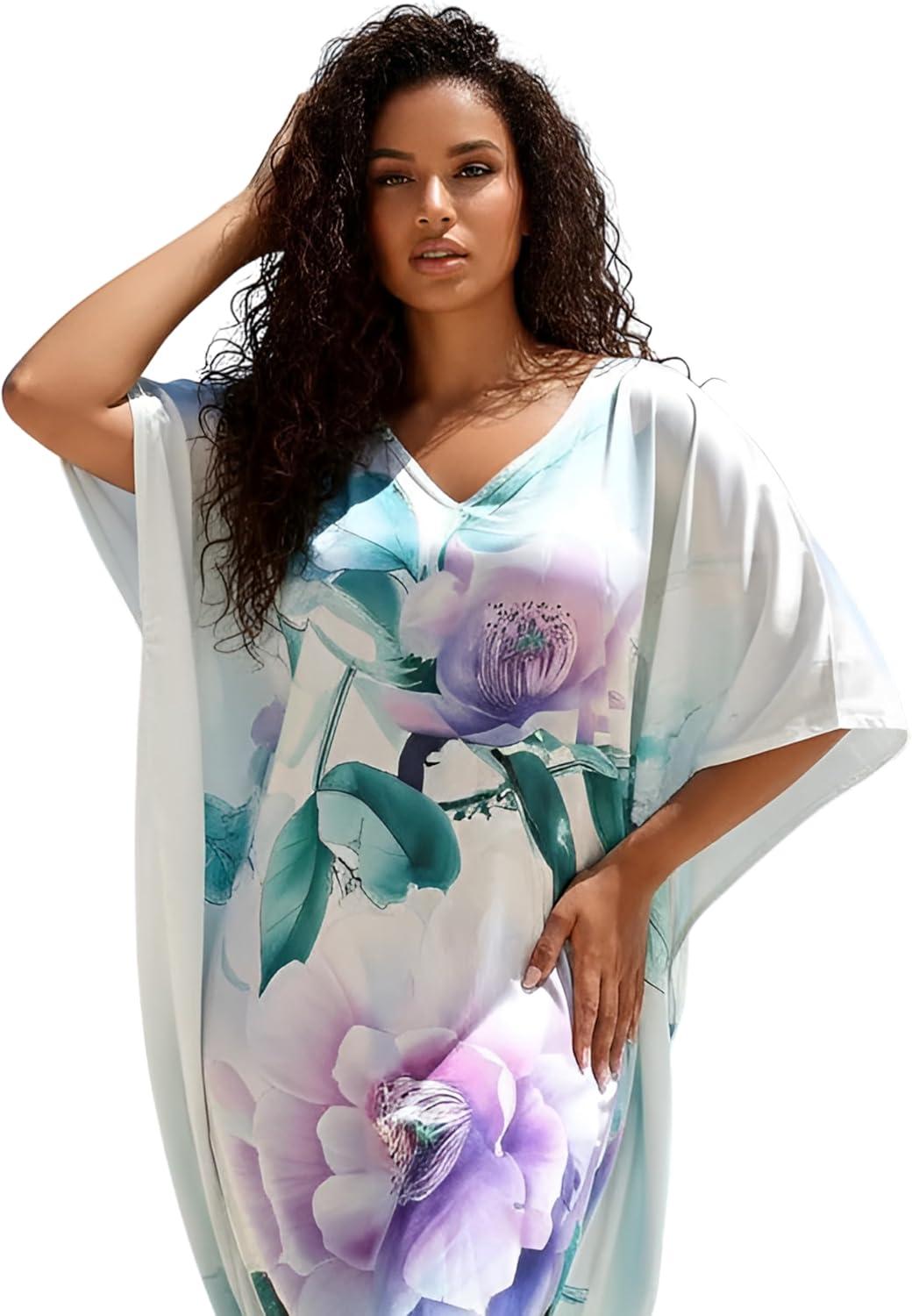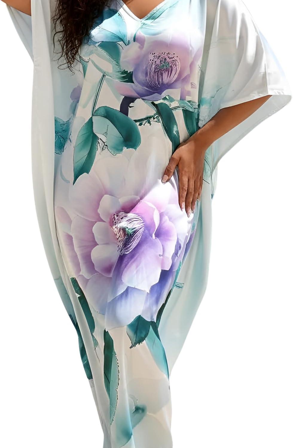 Gypsie Blu Women Caftan Dress Plus Size Satin Silk Printed Beach Cover Up Maxi Dresses Kimono Sleeve for Holidays Lounge Wear(Light Cream Abstract Floral)