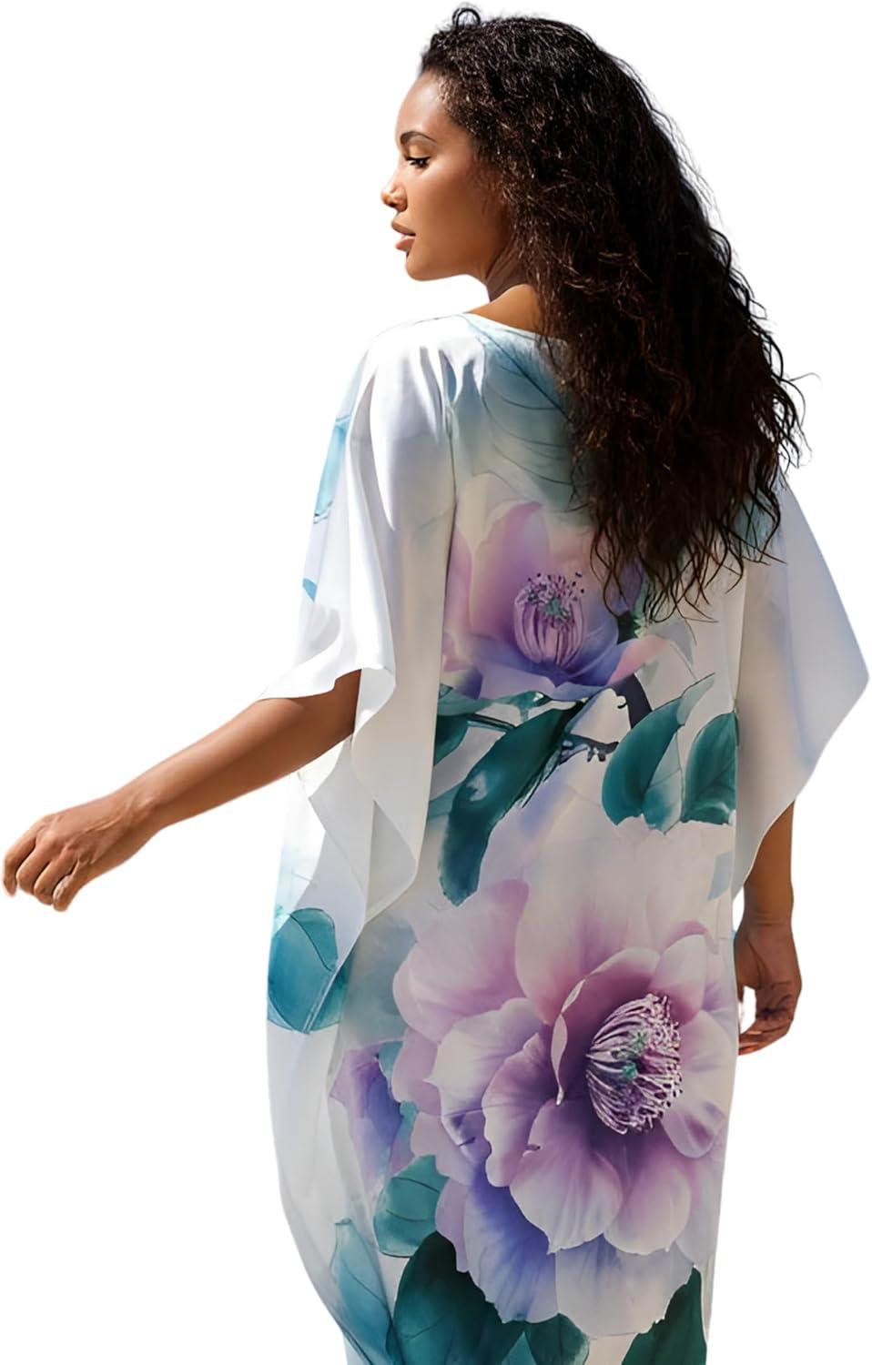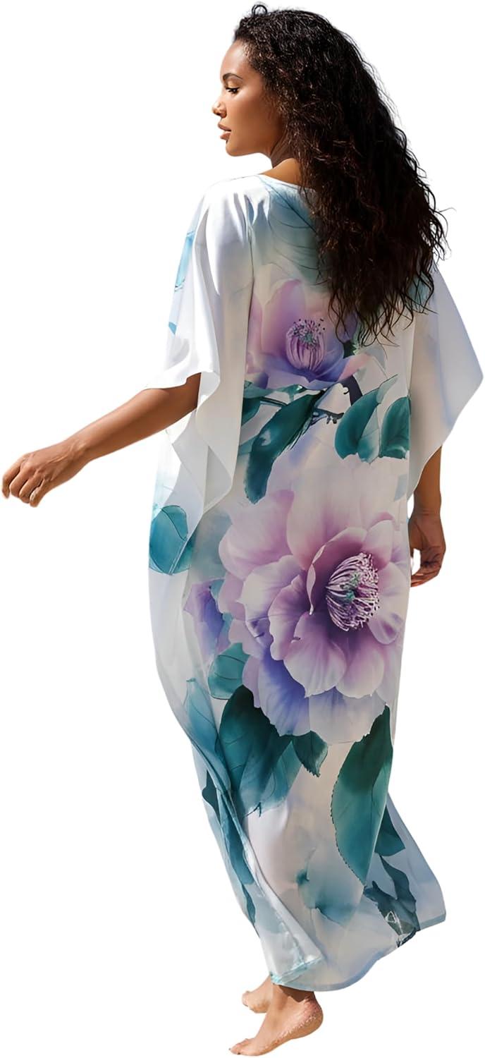 Gypsie Blu Women Caftan Dress Plus Size Satin Silk Printed Beach Cover Up Maxi Dresses Kimono Sleeve for Holidays Lounge Wear(Light Pink Flower)