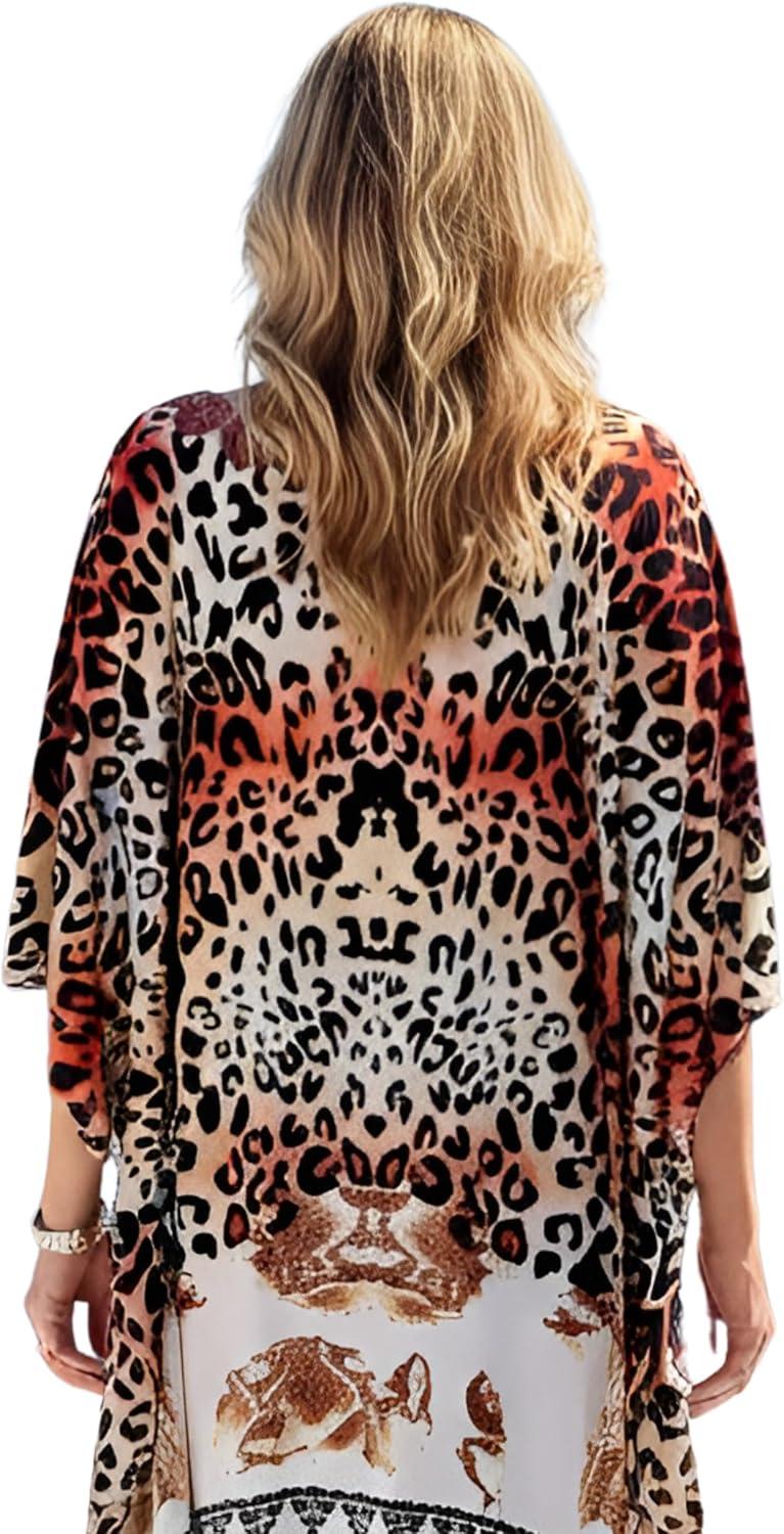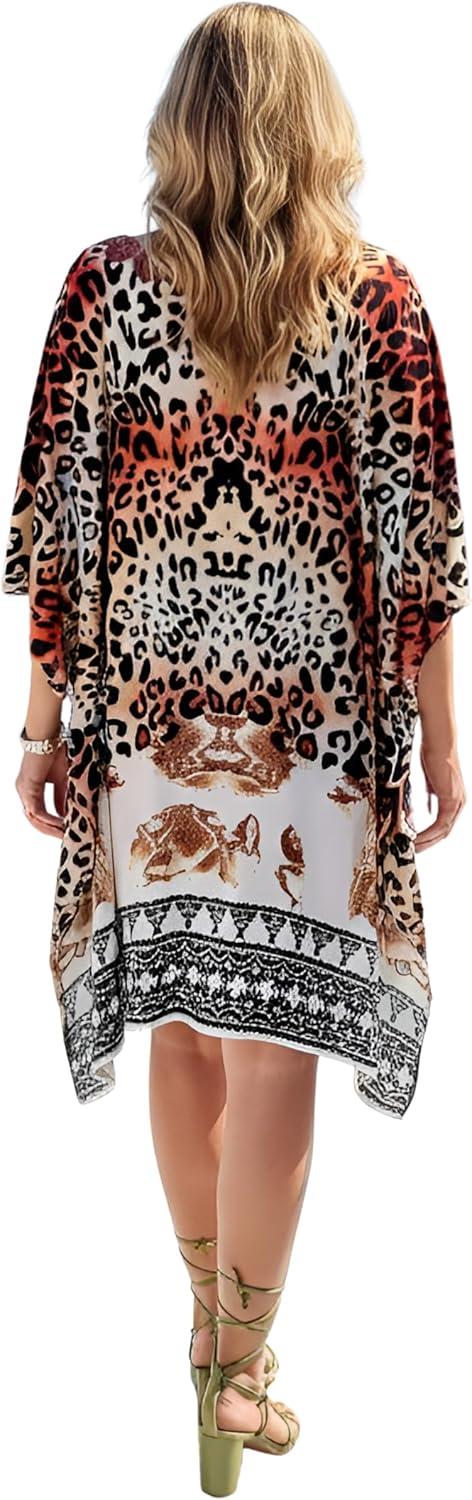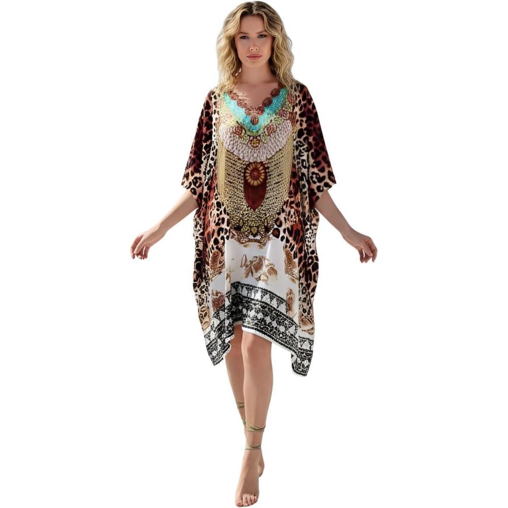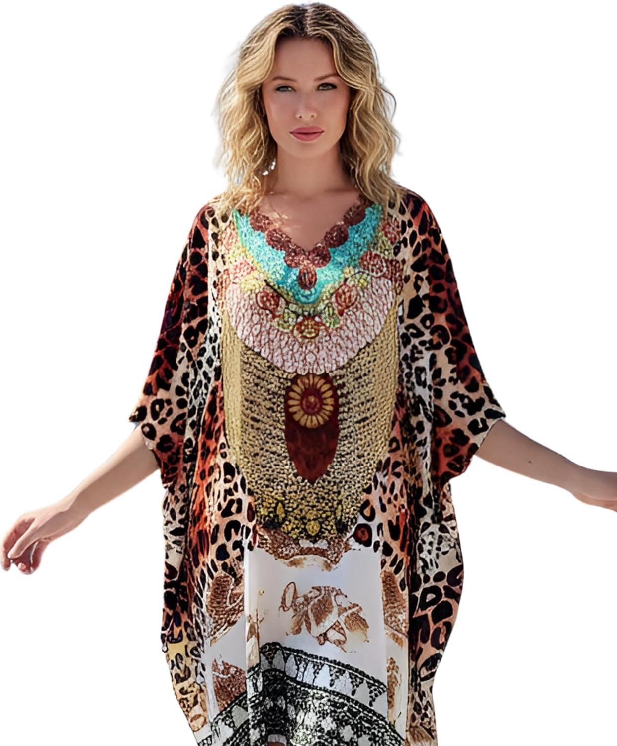 Gypsie Blu Women Satin Short Caftan Dress Printed Plus Size Rhinestone Embroidery Tunic Tops Dresses Beach Cover Up for Party(Caramel Brown)